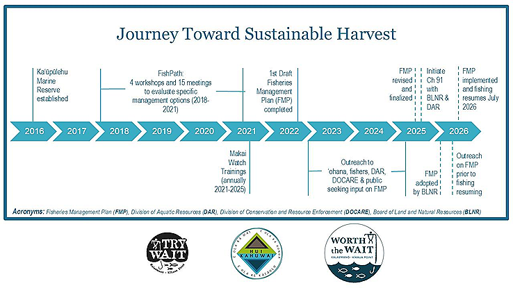 For many years we have been deliberating on what the fisheries plan should include, and through thoughtful discussion with our fishing ʻohana, the State Division of Aquatic Resources (DAR) and Division of Conservation and Resource Enforcement (DOCARE), and partners. We have made four revisions to the Fisheries Management Plan to integrate the feedback received.